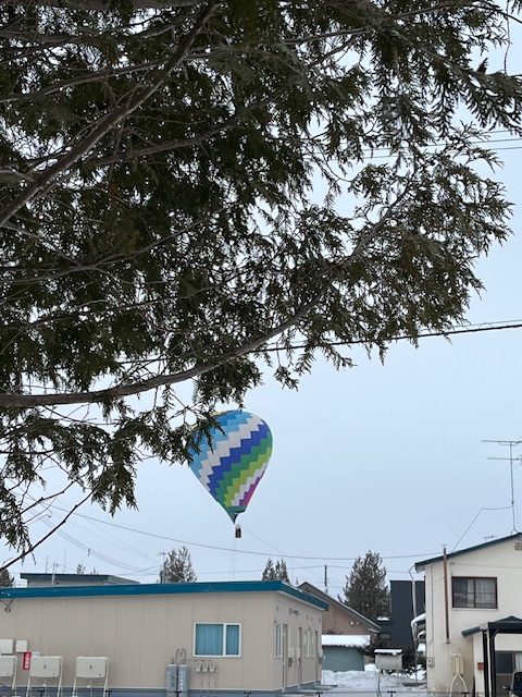 2025.12.24 ブログ クリスマスイブですね おはようございます。 今日の上士幌は曇り空、地面にはうっすら雪がありましたが 気温はプラスになりそうです。 今朝、久しぶりにゴーッという音で目が覚めました。 窓の外を探すと上士幌バルーンクラブの気球が 飛び立つところ?降りるところ?でした。 クリスマスフライトかな? 皆さま、よいクリスマスを!!